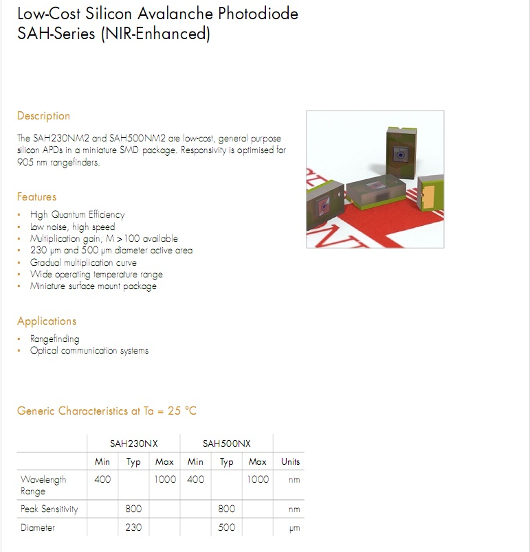 Low-Cost Silicon Avalanche Photodiode SAH-Series(NIR-Enhanced) 페이지 정보 작성자 관리자 조회 12,167회 작성일 15-06-18 15:34 본문 - 목록 이전글[Optotune] Laser Processing 15.06.30 다음글Laser Components 社의 제품 분류표 15.01.06