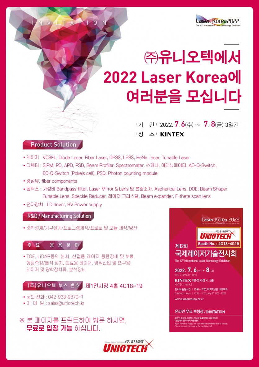 제 12회 국제레이저기술전시회 (Laser Korea 2022) 온라인 무료 초청장 페이지 정보 작성자 admin 조회 9,671회 작성일 22-05-17 11:12 본문 목록 이전글The Dual Laser diode coaxial module 출시 22.06.07 다음글450 nm High Power Semiconductor Laser System 출시! 22.05.06